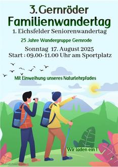 Zu Ihrem 3. Familienwandertag lädt die Wandergruppe Gernrode alle Wanderfreunde aus Nah und Fern am 17. August 2025 nach Gernrode ein. Gleichzeitig führt der KSB mit unserem Wandertag den 1. Eichsfelder Seniorenwandertag durch und unser Natur- und Aktivlehrpfad wird offiziell seiner Bestimmung übergeben. Dies vor allem deshalb, da in den nächsten Tagen auch der geplante 12 m lange Barfußpfad fertig gestellt wird und dann ausprobiert werden kann.