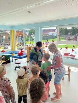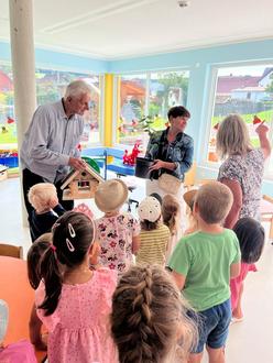 Heute haben wir ganz besonderen Besuch in unserer Einrichtung empfangen. Stephan Domann und Nicole Pfützenreuter vom Kirchbauverein Wülfingerode kamen zu uns. Sie schauten sich unser neues Kindergartengebäude an und überreichten den Kindern ein großes Vogelhäuschen, welches auf unserem Gelände aufgestellt werden soll. Außerdem brachten sie uns noch eine kleine Linde mit, die ebenfalls auf unserem Außengelände einen schönen Platz bekommen wird.
