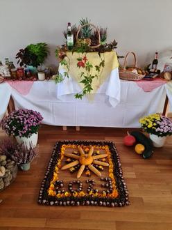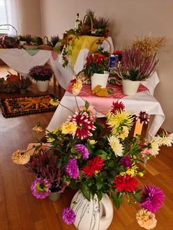 Am 4. Oktober haben wir wieder das Erntedankfest mit den Senioren gefeiert. Das Pfarrheim wurde schön dekoriert. Obst, Gemüse, Wurst, Brot und Wein, alles was die Natur im Herbst bereit hält, haben wir zusammen getragen und dekorativ platziert. Auch die Tische waren herbstlich geschmückt.
