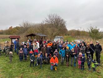 Am Samstag dem 8. November war dann wieder eine große Pflanzaktion bei welcher ca. 125 Eichen, Linden, Erlen, Weißtannen usw. und auch Obstbäume angepflanzt wurden. 5 große Jubiläumsbäume lassen diese besondere Baumreihe nun schon auf 21 Stück anwachsen. Die Teilnahme war überwältigend: Erwachsene, Jugendliche, Kinder und Familien packten kräftig an. Viele waren schon seit Beginn dabei, manche halfen das erste Mal. Besonderer Wert wurde in diesem Jahr wieder auf einen verbesserten Schutz gegen Wildverbiss gelegt - gerade im hintern Pflanzbereich werden die Bäume immer wieder durch Rehwild beschädigt. Nach dem alle Bäume in der Erde waren, gab es eine kräftige Brotzeit und für alle Kinder eine Überraschung. Herzlichen Dank an die fleißigen Frauen, welche die Brotzeit liebevoll vorbereitet hatten.