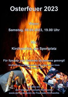 In diesem Jahr wollen wir in alter Tradition wieder unser Osterfeuer am Sportplatz durchführen. Los geht es am Ostersamstag den 08.04.2023 um 19.00 Uhr. Für Speisen und Getränke sorgt in gewohnter Weise der Förderverein der Feuerwehr Kirchworbis. Wir laden alle Gäste aus Nah und Fern herzlich ein!