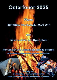 Auch dieses Jahr führt die Feuerwehr Kirchworbis wieder ihr traditionelles Osterfeuer am Sportplatz durch. Los geht es am Ostersamstag, den 19.04.2025 um 19.00 Uhr. Für Speisen und Getränke sorgt in gewohnter Weise der Förderverein der Feuerwehr Kirchworbis. Wir laden alle Gäste aus Nah und Fern herzlich ein!