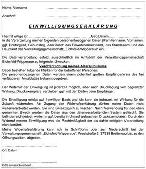 Eine Ausfertigung der Einwilligungserklärung ist dem Amtsblatt beigefügt. Auch befindet sie sich auf der Internetseite www.eichsfeld-wipperaue.de.