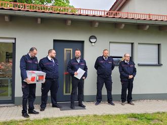 Wehrführer Steffen Schreiber eröffnete zusammen mit seinem Vorgänger Bernd Schrumpf, unseren Ortsbrandmeistern Fabian Harseim und Kevin Schenk, seinem Stellvertreter Eric Herz, der zuständigen Ortsteilbürgermeisterin Heike Leise und mir das Gerätehaus.