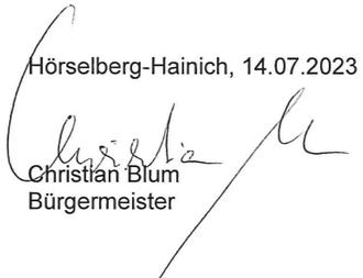 | 2. | Der Gemeinderat der Gemeinde Hörselberg-Hainich beschloss in der Sitzung am 27.06.2023 über die Feststellung der geprüften Jahresrechnung 2020 (§ 80 Abs. 3 ThürKO) mit Beschluss-Nr.: 2023/032 sowie über die Entlastung des Bürgermeisters und der Beigeordneten (§ 80 Abs. 3) mit Beschluss-Nr.: 2023/033d. |
