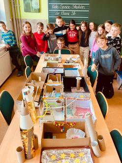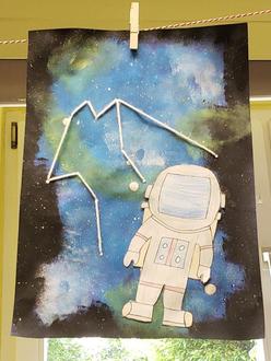 In den dritten Klassen wurde es noch vielfältiger: Hier haben die Kinder Weltraumbilder gezeichnet, Sternbilder gestickt und die Planeten intensiv mit Büchern, Sachtexten und dem Internet erforscht. Spannend war auch der Tag zum Thema Raumfahrt, bei dem die Kinder an verschiedenen Stationen erfuhren, wie man Astronaut oder Astronautin werden kann und welche Aufgaben sie im All haben. Nach einem Raumfahrt-Check konnten die Kinder ihrer Fantasie freien Lauf lassen: Sie entwarfen Weltraumfahrzeuge, bauten Raketen und sogar eine Kids-Space-Station. Außerdem übten sie die Kommunikation mit der Ground Control, kreierten im Ernährungslabor einen leckeren Weltraum-Snack und starteten mit viel Spaß und Action eine Wasser-Luftdruck-Rakete.
