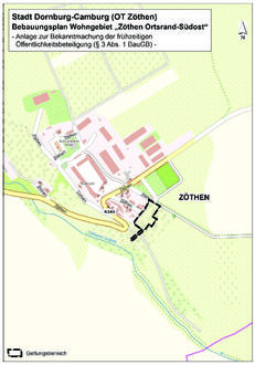 Der Stadtrat der Stadt Dornburg-Camburg hat den Beschluss zur Aufstellung des Bebauungsplanes „Zöthen Ortsrand-Südost“ mit dem Planungsziel gefasst, für die Flächen im Südosten der Ortslage Zöthen die bauplanungsrechtlichen Voraussetzungen für eine begrenzte Wohnbebauung zu schaffen. Die Abgrenzung des Plangebietes ist der Anlage zu dieser Bekanntmachung zu entnehmen.
