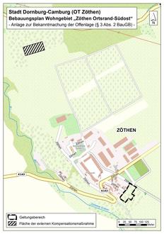 Der Stadtrat der Stadt Dornburg-Camburg hat in seiner Sitzung am 07.05.2024 den Entwurf zur Aufstellung des Bebauungsplanes Wohngebiet „Zöthen Ortsrand-Südost“ gebilligt und zur Offenlage gem. § 3 Abs. 2 BauGB sowie zur Behördenbeteiligung gem. § 4 Abs. 2 BauGB beschlossen. Ziel der Planung ist die Schaffung der bauplanungsrechtlichen Voraussetzungen für eine begrenzte Bebauung am südöstlichen Ortsrand der Ortslage Zöthen.