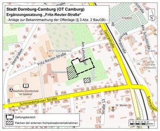 Der Stadtrat der Stadt Dornburg-Camburg hat in seiner Sitzung am 07.05.2024 den Entwurf der Ergänzungssatzung „Fritz-Reuter-Straße“ in Camburg in der Fassung vom 5. April 2024 und die dazugehörige Begründung gebilligt und zur öffentlichen Auslegung und Beteiligung der Behörden, Nachbargemeinden und sonstigen Träger öffentlicher Belange bestimmt. Planungsziel ist die Schaffung der bauplanungsrechtlichen Voraussetzungen für eine Wohnbebauung südlich der Fritz-Reuter-Straße in Camburg.