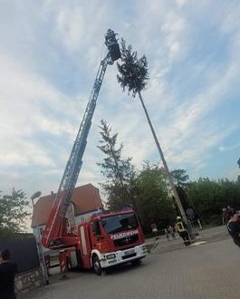 Zuerst stellten die Mitglieder der Jugendfeuerwehr ihren etwas kleineren Baum auf. Danach folgte der große Baum, den die Kameraden der Freiwilligen Feuerwehr, als eingespielte Truppe, Stück für Stück in die Höhe stemmten. Begleitet wurden sie dabei von der Schalmeienkapelle Wetterzeube, die inzwischen zu einem festen Partner unserer Veranstaltungen geworden ist und mit mehreren Auftritten zum Gelingen des Abends beitrug.
