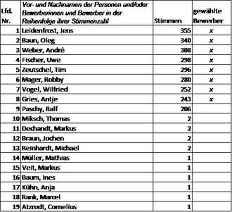 | Lfd. Nr. | Vor- und Nachnamen der Personen und/oder Bewerberinnen und Bewerber in der Reihenfolge ihrer Stimmenzahl | Stimmen | gewählte Bewerber |