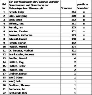 | Lfd. Nr. | Vor- und Nachnamen der Personen und/oder Bewerberinnen und Bewerber in der Reihenfolge ihrer Stimmenzahl | Stimmen | gewählte Bewerber |