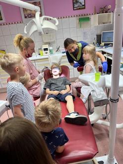 Schon lange geplant war ein Besuch bei unserer Zahnärztin Sandra. Dieses Mal drehte sich alles darum, wie es in der Praxis abläuft. Von der Klingel, über die Anmeldung mit der Chipkarte bis zur Vorbereitung des Personals. Sehr interessant für uns alle. Die Sauberkeit und Gesundheit stehen an erster Stelle. Nachdem den Kindern die Zähne kontrolliert wurden, durften sie selber mal Zahnarzt spielen. Mit Mundschutz, Handschuhen und Unterstützung schauten sie in den Mund eines Kindes. Ein Anderer saugte dabei den überschüssigen Speichel weg. Zum Schluss zeigten Sandra und Doreen uns noch ein Röntgenbild von einem Vorschulkind. Das sah sehr eigenartig aus. Die Zähne, die man sieht und die Zähne, die noch im Kiefer sitzen und darauf warten, raus zu kommen.