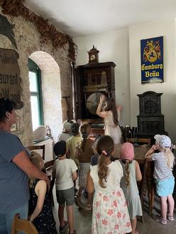 Am Donnerstag waren wir in unser Stadtmuseum eingeladen. Julia empfing uns sehr herzlich und wollte erst einmal wissen, wie man sich in einem Museum verhält. Sehr wichtig, bei den vielen wertvollen, alten Sachen hier. Dann zeigte sie uns die Anfänge der menschlichen Werkzeuge, alte Knochen und altes Geschirr. Unvorstellbar für die Kinder, wieviel Mühe sich die Menschen gemacht haben, um Bücher, Schuhe und andere Dinge herzustellen. Was mussten die Frauen alles leisten, um Wäsche zu waschen. Heutzutage helfen uns viele elektrische Geräte. Am spannendsten war aber die alte Spieluhr und natürlich die Arrestzelle. Da möchte keiner von uns rein.