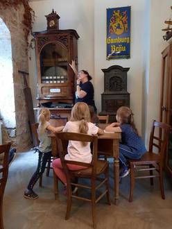 Anhand kleiner Briefe mit Symbolen, die in den verschiedenen Räumen des Museums versteckt waren, wurden die Kinder durch die Handwerksgeschichte von Camburg geführt. Wir besichtigten u. a. die Werkstätten des Schusters, Böttchers, Stellmachers, Müllers, Buchbinders, Stellmachers und die alte Drogerie. Vom Gefängnis mit den massiven Eichentüren, großen Schlössern und dem Sichtloch waren die Kinder stark beeindruckt. Die Führung endete in einer alten Gaststube mit einer klingenden Spieluhr aus dem Jahre 1890.