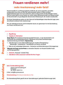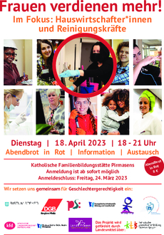 Anlässlich des Internationalen Frauentages laden die Gleichstellungsbeauftragte und die Ortsgemeinde Waldfischbach-Burgalben zum Kabarett Weibsbilder in das Bürgerhaus Schuhfabrik ein. Karten sind ausschließlich online unter www.bürgerhaus-schuhfabrik.de erhältlich, keine Abendkasse. Zum Equal Pay Day organisiert der Arbeitskreis Frauen und Erwerbsarbeit am 18.04., 18.00 Uhr, zum nunmehr sechsten Mal die Veranstaltung Frauen verdienen mehr. Veranstaltungsort ist die Katholische Familienbildungsstätte. Wir informieren zeitnah.