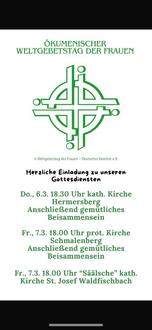 | 18:00 Uhr | Gottesdienst in Waldfischbach, kath. Pfarrsaal (WGT-Team) |