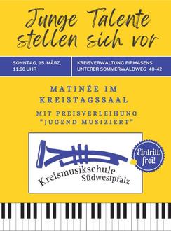 Am Sonntag, 15. März, um 11 Uhr lädt die Kreismusikschule zur Matinée „Junge Talente stellen sich vor* in den Kreistagssaal der Kreisverwaltung nach Pirmasens ein. Im Mittelpunkt stehen die diesjährigen Preisträgerinnen und Preisträger des renommierten Wettbewerbs „Jugend musiziert" aus dem gesamten Landkreis Südwestpfalz.
