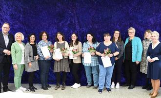 Nach Überreichung der Zertifkate freuten sich gemeinsam Oberbürgermeister Markus Zwick, Bettina Walnsch (Jugendamt Stadt Pirmasens), Brigitte Facco (Leiterin Familienbildungsstätte), Greta Grohovaz, Claudia Splittgerber, Sarah Meyer, Cornelia Kullmer, Gabriele Bracero, Franziska Büffel (Jugendamt Landkreis Südwestpfalz), Bärbel Nelke (Dozentin Familienbildungsstätte), Annette Eger (Jugendamt Landkreis Südwestpfalz) und Landrätin Dr. Susanne Ganster.