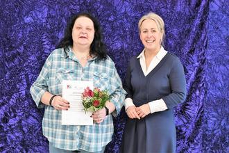 Cornelia Kullmer freut sich mit Landrätin Dr. Susanne Ganster über die Qualifikation als Tagespflegeperson, für die ihr Dr. Ganster das zugehörige Zertifikat überreichte.