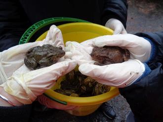 Der 3. Kreisbeigeordnete Manfred Seibel, rechts im Bild mit Warnweste, hat sich beim Kröten retten beteiligt und gemeinsam mit einer Schulklasse eimerweise Erdkröten ins Laichgewässer gebracht.