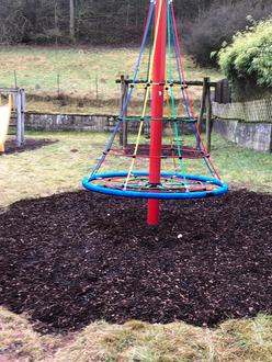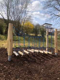 Für den Spielplatz auf dem Neuhof wurde eine Seiltreppenbrücke installiert, die sich in das abschüssige Gelände gut eingefügt hat.