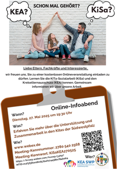 Für Dienstag, 27. Mai, 19.30 bis 21 Uhr, laden die Kita-Sozialarbeit und der Kreiselternausschuss im Landkreis Südwestpfalz alle Interessierten zu einer kostenlosen Online-Infoveranstaltung ein. Sowohl die Kita-Sozialarbeit, die als neues sozialpädagogisches Angebot die Erziehungs- und Bildungsarbeit der pädagogischen Fachkräfte in den Kindertagesstätten ergänzt, als auch der Kreiselternausschuss, der als Interessenvertretung der Kita-Eltern auftritt, wurde im Jahr 2021 gesetzlich verankert. Diese Infoveranstaltung bietet Eltern, Fachkräften und allen Interessierten die Möglichkeit, die jeweiligen Akteure kennenzulernen. Sie können Einblicke in deren Arbeit gewinnen, zudem geht es um die Unterstützungsmöglichkeiten und Zusammenarbeit in den Kindertagesstätten im Landkreis.