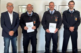 Wolfgang Denzer und Christoph Kästner gratulierten beiden zum 1. Juni ernannten Feuerwehrleuten und wünschten ihnen gute Entscheidungen in ihren Ämtern.