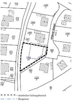 Gegenstand der Änderung ist die Erweiterung des festgesetzten Baufensters um 1,30 m nach Südosten zum öffentlichen Fußweg Flurstück Nr. 992/13 und um 2,30 m nach Westen zum öffentlichen Weg Flurstück Nr. 992/4.