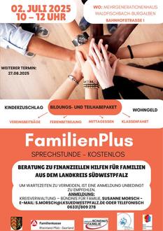 Unter dem Dach des Lokalen Bündnisses für Familie im Landkreis Südwestpfalz gibt es am Mittwoch, 02. Juli, eine weitere Sprechstunde FamilienPlus - Beratung zu finanziellen Hilfen für Familien mit geringem Einkommen. Die Beratung erfolgt von 10 bis 12 Uhr im Mehrgenerationenhaus Waldfischbach-Burgalben, Bahnhofstraße 1, das auch per Bus und Bahn gut zu erreichen ist.