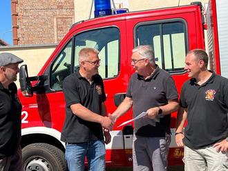Verbandsbürgermeister Wolfgang Denzer nutzte das Feuerwehrfest in Leimen und überreichte die Urkunde im Beisein von Wehführer Benjamin Helfrich und dem zweiten Stellvertreter Sven Pirrmann.