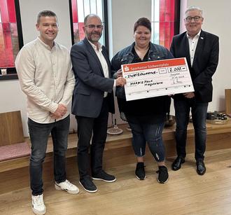 Zusammen mit Verwaltungs-Mitarbeiter Christoph Sommer, der die Idee zu der Veranstaltung hatte und das Turnier zusammen mit einem Team organisiert hat, übergab Verbandsbürgermeister Wolfgang Denzer den Scheck an die Hospizleiterin Simone Jennewein und den kaufmännischen Vorstand Carsten Steuer. „Es ist ein gutes Gefühl, diesen Scheck heute zu übergaben“, sagte der Bürgermeister und ergänzte: „Wir freuen uns, die wertvolle Arbeit der Einrichtung unterstützen zu können und sind sicher, dass das Geld hier richtig aufgehoben ist.“