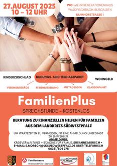 Unter dem Dach des Lokalen Bündnisses für Familie im Landkreis Südwestpfalz gibt es am Mittwoch, 27. August, eine weitere Sprechstunde FamilienPlus - Beratung zu finanziellen Hilfen für Familien. Die Beratung erfolgt von 10 bis 12 Uhr im Mehrgenerationenhaus Waldfischbach-Burgalben, Bahnhofstraße 1, das auch per Bus und Bahn gut zu erreichen ist.