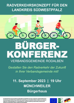 Am Montag, 11. September, haben die Bürgerinnen und Bürger der Verbandsgemeinde Rodalben die Möglichkeit, sich aktiv an der Entwicklung des kreisweiten Radverkehrskonzeptes zu beteiligen: Im Rahmen einer Bürgerkonferenz stellt das Verkehrsplanungsbüro R+T aus Darmstadt die bisherigen Ergebnisse und insbesondere die in der Verbandsgemeinde geplanten Maßnahmen vor und diskutiert diese mit den Anwesenden. Die Bürgerkonferenz beginnt um 19 Uhr im Bürgerhaus Münchweiler, Hanauer Straße 4.