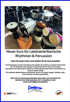 Für Lateinamerikanische Rhythmen & Percussion startet ein neuer Kurs. Ein neues Ensemble hat sich der Percussion-Lehrer der KMS auch zum Ziel gesetzt und sucht Musiker dafür. Trommlergruppen und Percussionbands sind populär, das gilt gleichermaßen für exotische aus anderen Kulturkreisen, wie beispielsweise Westafrika, oder an den Rhythmen der Pop- und Jazzmusik orientierten. Wer Spaß an einer Mischung aus Rhythmus, Vielfalt, gemeinsamem Üben und Auftritten hat, ist bei der KMS genau richtig! Dort werden Spieltechniken und Rhythmen erarbeiten, die mit Congas, Bongos, Timbales, Cajón, Guirio, Máracas und Claves gespielt werden können.