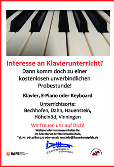 Das Klavier ist der König der Instrumente. Es öffnet die Tür zur musikalischen Entfaltung. Diese Tür öffnet die Kreismusikschule Südwestpfalz (KMS) Interessierten mit kostenlosen Probestunden zum Ausprobieren vor dem Einstieg in einen Klavier- und Percussionunterricht an. Die KMS richtet sich damit an Erwachsene und Kinder.