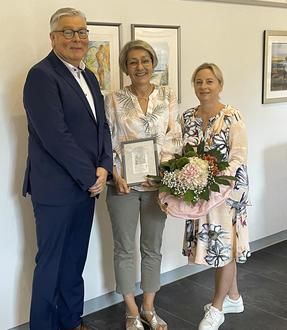 Im Rahmen einer kleinen Feierstunde bedankte sich Wolfgang Denzer für die geleistete Arbeit sowie das Engagement und überreichte der zukünftigen Rentnerin den obligatorischen Blumenstrauß und eine Grafik des pfälzischen Künstlers Armin Hott. Für den Personalrat sprach die Vorsitzende Michaela Littig-Merkle ein kurzes Grußwort und überreichte ebenfalls ein Geschenk.