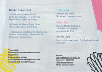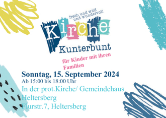 | 15:00 Uhr | Kirche Kunterbunt in Heltersberg (Pfarrer Dr. Ulrich Hofeditz, Gemeindediakonin Gabi Rathke u. Team) |