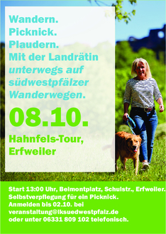 „Ich freue mich auf Rückmeldungen von möglichst vielen Mitbürgern und Mitbürgerinnen für die Tour im Oktober auf einem Teilstück der wunderschönen Hahnfels-Tour, wenn wir wieder unterwegs auf südwestpfälzer Wanderwegen sind. Dabei kann man einfach und ungezwungen ins Gespräch kommen und sich gerade auch beim Picknick entspannt austauschen“, sieht Landrätin Dr. Ganster jetzt gespannt der Tour im eigenen Heimatort entgegen. Anmeldungen nimmt das Vorzimmer der Landrätin per E-Mail an veranstaltung@lksuedwestpfalz.de oder unter 06331 809 102 telefonisch entgegen.