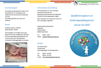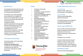 Die Stadt Zweibrücken bietet ab Januar einen Qualifizierungskurs an, an dem auch Interessierte aus dem Landkreis Südwestpfalz teilnehmen können. Dazu bietet das Jugendamt der Stadt Zweibrücken eine Informationsveranstaltung an: am Mittwoch, 9. Oktober, ab 19 Uhr im Untergeschoss der Kita Sonnenschein in Zweibrücken, Hohlstraße 22.