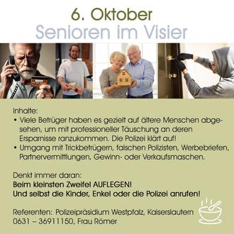 Am Sonntag, 6. Oktober, fand im Pfarrheim Clausen um 14 Uhr eine Informationsveranstaltung unter dem Motto „Senioren im Visier“ statt. Eingeladen hatte das Polizeipräsidium Westpfalz, um ältere Bürgerinnen und Bürger über aktuelle Betrugsmaschen aufzuklären.