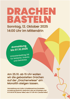 Der Kultur- und Sozialausschuss des Gemeinderats Donsieders lädt alle Kinder herzlich ein zum Drachenbasteln im "Mittendrin"!