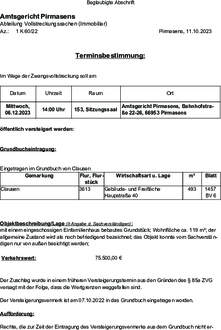 | Mittwoch, 06.12.2023 | 14:00 Uhr | 153, Sitzungssaal | Amtsgericht Pirmasens, Bahnhofstraße 22-26, 66953 Pirmasens |