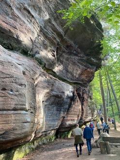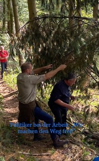 Im Anschluss führte die Wanderung vorbei an weiteren beeindruckenden Felsformationen, wie dem Rappenteich-, Sau- und Krappenfelsen und beinhaltete überraschenderweise einen, über den Weg in Richtung Schützenhaus, umgefallenen Baum, welcher jedoch mit vollem Körpereinsatz unseres 1. Beigeordneten Timo Bäuerle und Stadtbürgermeister Claus Schäfer zur Seite geräumt wurde. Wer sagt, Politiker werfen einem nur Steine in den Weg, der sollte an der Gräfensteiner Wanderwoche teilnehmen, hier werfen Ihnen die Politiker Bäume AUS dem Weg! Nach der „Wir machen den Weg frei!“- Aktion liefen wir weiter zurück zum PWV-Hilschberghaus.
