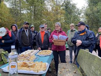 Die Tour führte, vorbei an der Grundschule und der katholischen Kirche, der Dorfmitte mit Hawebrunnen und Maibaum, hinauf zum höchsten Aussichtspunkt, dem Kreuzberg. Den „Kreuzweg“ (1843) begehend, erreichte die Gruppe die Kreuzbergkapelle. Im Anschluss ging es bergab zum „Buschebrunnen“. Dort gab es als Gaumenschmaus leckeren selbstgemachten Kuchen, Kaffee und natürlich den obligatorischen Wanderschnaps. Danach führte die Wanderung über das obere Hollertal zum Solarpark (2012) mit kurzem Rundgang und Blick auf die noch bestehende Bunkeranlage. Auf dem Rückweg wanderten die Teilnehmer und Teilnehmerinnen vorbei am Friedenskreuz, dem „Härebrinnel“ und dem Gilletplatz, über die Dorfmitte wieder zurück zum Ausgangspunkt, dem Sportheim des FK Clausen, in welchem die Gruppe die Wanderung mit einem gemeinsamen Mittagessen die Tour beendete. Die langjährige Teilnehmerin, Monika Schnellbacher berichtete mir: