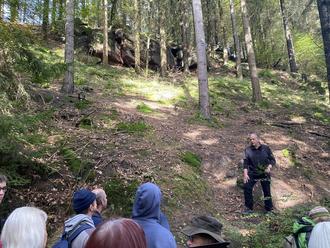 Zur zweiten Tour der 44. Gräfensteiner Wanderwoche trafen sich am Mittwochmorgen sage und schreibe 87 Wandersleute am Wanderparkplatz „Sauweiher“ in Münchweiler an der Rodalb. Dieses Mal durch den Wettergott Petrus verschont, starteten die Teilnehmer und Teilnehmerinnen nach der Begrüßung durch den Verbandsbürgermeister Wolfgang Denzer, den 1. Beigeordneten und gleichzeitig Ortsbürgermeister von Münchweiler, Timo Bäuerle sowie Wanderführer Matthias Jäger in Richtung Trifelsblick. Die beiden letztgenannten untermalten die vielen Sehenswürdigkeiten der Wanderung durch fundiertes und unterhaltsam präsentiertes Wissen. Vorbei am „Herzebrünnel“, an dem es den obligatorischen Starterschnaps gab, hinunter zur Erzgrube, wieder den Langenberg hinauf, auf dem die Wandergruppe mit Kaffee, Kuchen und einer musikalischen Einlage von Dietmar Kraus mit seinem Jagdhorn überrascht wurden. Nach der kurzen Rast ging es weiter bergauf, vorbei am Wilhelmsbrünnel, dem Luitpoldturmblick, dem Opferstein bis zum Trifelsblick. Die Aussicht und die Atmosphäre entlockte den begeisterten Wandersleuten eine spontane, mitnehmende Gesangseinlage. Vom Trifelsblick aus wanderte die Gruppe, vorbei am Schäfer-Gretels-Felsen, mit seiner traurig-schauerlichen Geschichte, zu einer privaten Hütte, an der sie Ortsbürgermeister Timo Bäuerle mit Getränken und leckeren Bratwürsten verköstigte.