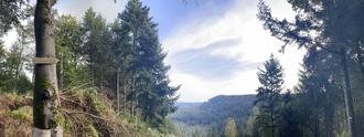 Den Abschluss der Wanderwoche machte die Gemeinde Merzalben. So trafen sich 56, erneut dem Regen trotzende, Teilnehmer und Teilnehmerinnen am Freitagmorgen am Parkplatz „Schäferei“ unterhalb der Burg Gräfenstein. Zum ersten Mal führten die Eheleute Monika und Karl-Heinz Schnellbacher, selbst bereits langjährige Teilnehmer der Gräfensteiner Wanderwochen, die Wanderung in Merzalben. Nach der Begrüßung durch Verbandsbürgermeister Wolfgang Denzer und dem 1. Beigeordneten von Merzalben, Rüdeger Eser, tischte das Ehepaar Schnellbacher auch hier wieder zur Freude aller ihre köstlichen, selbstgemachten Leckereien auf. Nach dem vom Beigeordneten mitgebrachten Starterschnaps und einer kurzen Ansprache der Wanderführer, verteilte Monika Schnellbacher als kleines, mit Schleifchen versehenes Präsent, eine Kurzinformation über den „Naturwaldpfad“. Dieser, fast schon in Vergessenheit geratene, schöne, naturbelassene und märchenhafte Pfad mit seiner wohltuenden Bodenbeschaffenheit sollte nämlich das Highlight der Wanderung sein. Ganz nach dem Motto: Der Weg ist das Ziel! So führte die Tour entlang der Südseite des Winscherts, auf dem 5,3 km langen genannten "NatUrwaldpfad“, vorbei am Jagdfelsen durch das grüne Herz der Kernzone zum Luitpoldturmblick, an dem die Gruppe eine Vesperpause mit spendierten Brezeln machte. Hier hatte Petrus wohl kurzzeitig Nachsicht, so dass die Wanderer und Wanderinnen freie Sicht auf den, aus behauenem Sandstein errichtete viereckige Luitpoldturm hatten.