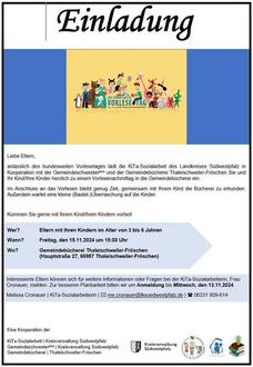 Anlässlich des bundesweiten Vorlesetages am 15. November lädt die Kita-Sozialarbeit des Landkreises Südwestpfalz gemeinsam mit der Gemeindeschwester plus und der Gemeindebücherei Thaleischweiler-Fröschen Eltern und Kinder zwischen drei und sechs Jahren zu einem Vorlesenachmittag ein: am Freitag, 15. November, ab 15 Uhr in der Gemeindebücherei Thaleischweiler-Fröschen, Hauptstraße 27.