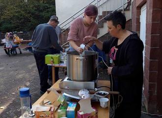 Mit tatkräftiger Hilfe der Dimbacher Latwerchexpertinnen Gerlinde und Anneliese rührten die begeisterten TeilnehmerInnen vier Stunden und fortwährend, schmeckten ab und probierten aus dem großen Topf, bevor sie das köstliche Latwerch in Gläser abfüllen konnten. Als weiteres Erlebnis stellten sie selbst Butter her. Dafür schüttelten die Kinder Sahne in Schraubgläsern. „Eine kraftzehrende und anstrengende Art und Weise unter Dauerschütteln Butter herzustellen“, stellte auch Jugendpflegerin Elke Hamm fest, ist sich mit den Teilnehmende aber auch sicher, dass sie dafür auf dem frischen Brot vom Bäckermeister aus Dimbach noch besser schmeckt! Denn nach dem gemeinsamen Herbstlied schlemmten sie, bis Latwerch, Butter und Brot restlos aufgegessen waren. Ein Glas selbstgekochtes Latwerch erinnert jede Familie noch an den Quetsche-Daa. Für dessen Gelingen von der tatkräftigen Hilfe in der Küche, über Spenden von Äpfeln, Honig, Kastanienkuchen, Kaffee, Apfelsaft und Brennholz wollen sich Hamm und Dietrich nochmals herzlich bedanken.