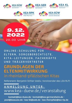 Am Freitag, 09.12.2022, findet um 20:00 Uhr ein kreisübergreifender Online-Informationsabend zum Thema „Grundlagen der Elternmitwirkung in rheinland-pfälzischen Kitas“ statt. Hierzu laden die fünf pfälzischen Kreiselternausschüsse Kaiserslautern (KEA KL), Südliche Weinstraße (KEA SÜW), Bad Dürkheim (KEA DÜW), Germersheim (KEA GER) und Rhein-Pfalz-Kreis (KEA RPK) alle Elternvertreter, Kita-Eltern, Fachkräfte und Interessierten ein.